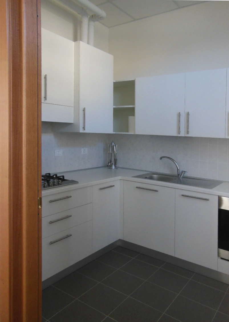 - Locale di servizio ad uso cucina di circa 7 mq, con piano cottura a quattro fuochi, cappa aspirante, lavello e frigorifero combinato.